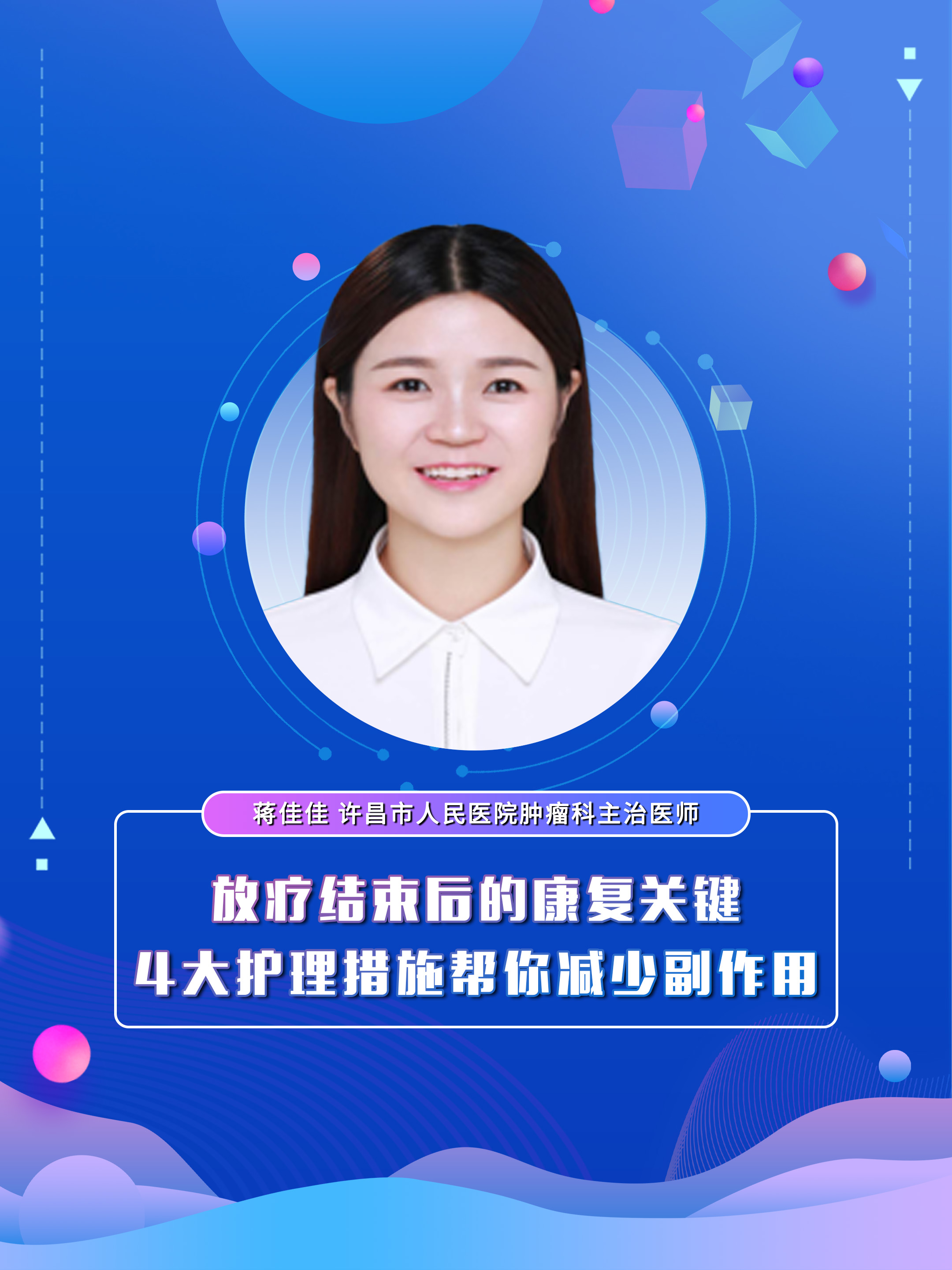 【放疗结束后的康复关键 4大护理措施帮你减少副作用】科普专家:蒋佳佳——许昌市人民医院肿瘤科主治医师