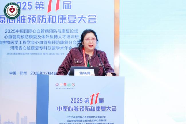中国康复医学会心血管病预防康复分会主任委员、长春中医药大学附属医院心内科心脏康复中心主任孟晓萍教授代表专委会致辞。她表示,作为连续多年参会的学者,每次参会都有新收获,高度认可张辉教授团队多年来深耕康复事业、推动行业普及与提升的显著成效。孟晓萍教授回顾,在胡大一老师的带领下,过去13年是中国心脏康复蓬勃发展的13年——从最初仅6个心脏康复中心,发展到如今近500家国家标准化心脏康复中心。她希望通过本次大会,让大家深化对心脏康复的认识,在理论与实践上实现提升,推动河南乃至全国心脏康复工作迈上新高峰。